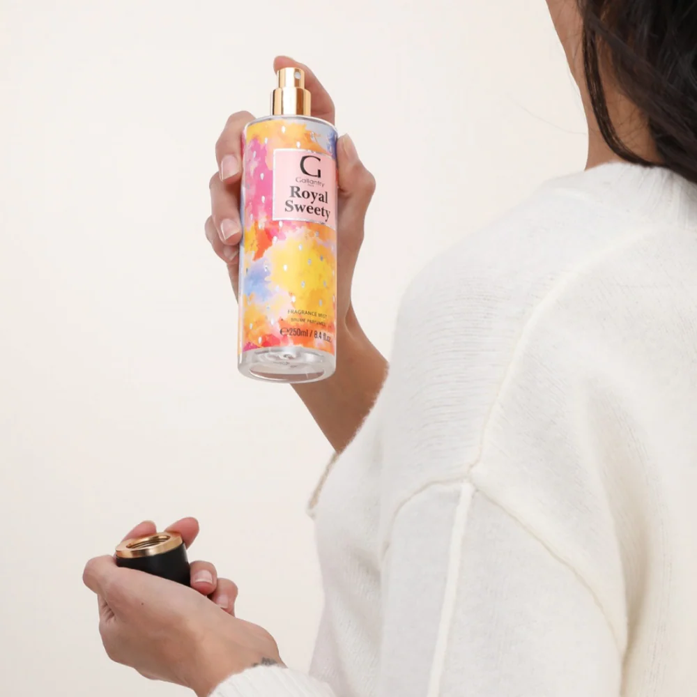 Le flacon de la brume parfumée Royal Sweety est un véritable bijou. Il permet de contempler le liquide clair à l'intérieur. Son design artistique, orné de nuances de jaune, rose, bleu et orange, crée une ambiance joyeuse et vibrante. Les petites pierres brillantes sur l'étiquette ajoutent une touche de sophistication, tandis que le capuchon noir avec une finition dorée accentue le luxe du produit.