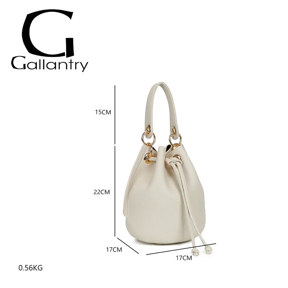 Avec ses dimensions de 22 cm de hauteur, 17 cm de largeur et 15 cm de profondeur, ce sac compact offre un espace suffisant pour vos essentiels, tout en restant léger avec un poids d'environ 0,56 kg. Sa silhouette arrondie et légèrement conique, associée à un fond plat, garantit une stabilité optimale.