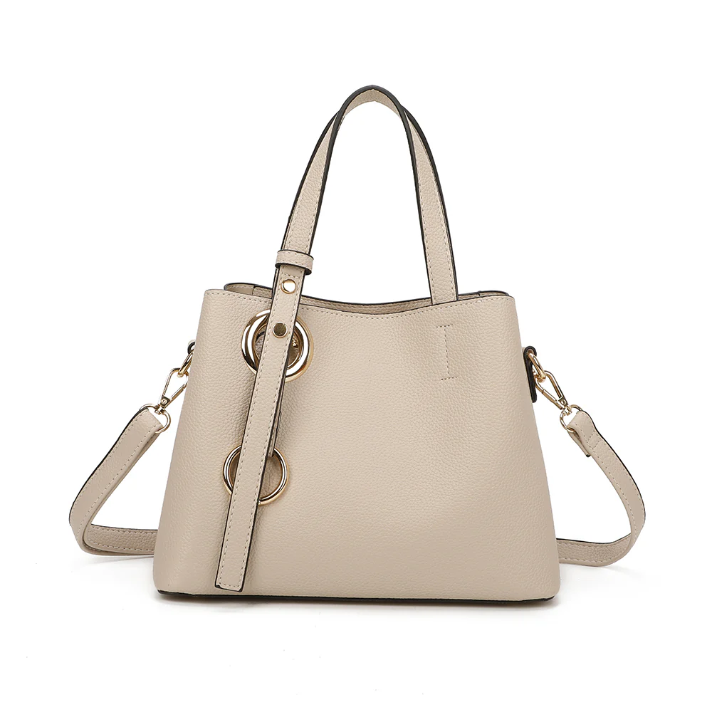 La Moderne (R-1710) de Gallantry est un sac à main qui allie élégance et praticité, conçu pour la femme moderne en mouvement. Fabriqué en simili cuir texturé, ce sac offre une sensation de luxe tout en étant facile à entretenir. Sa silhouette contemporaine et légèrement trapézoïdale, avec des bords arrondis, lui confère un aspect doux et féminin.