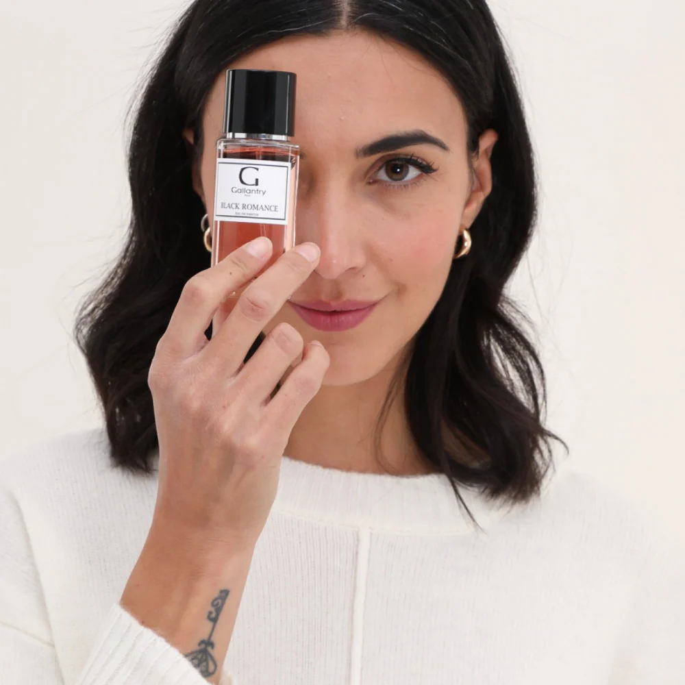 Ce parfum est idéal pour une utilisation quotidienne, comme le suggèrent les images montrant son application sur la peau, soulignant son attrait visuel et son accessibilité. Black Romance de Gallantry se distingue par son design élégant et sa couleur attrayante, faisant de ce parfum un choix parfait pour ceux qui recherchent style et qualité.